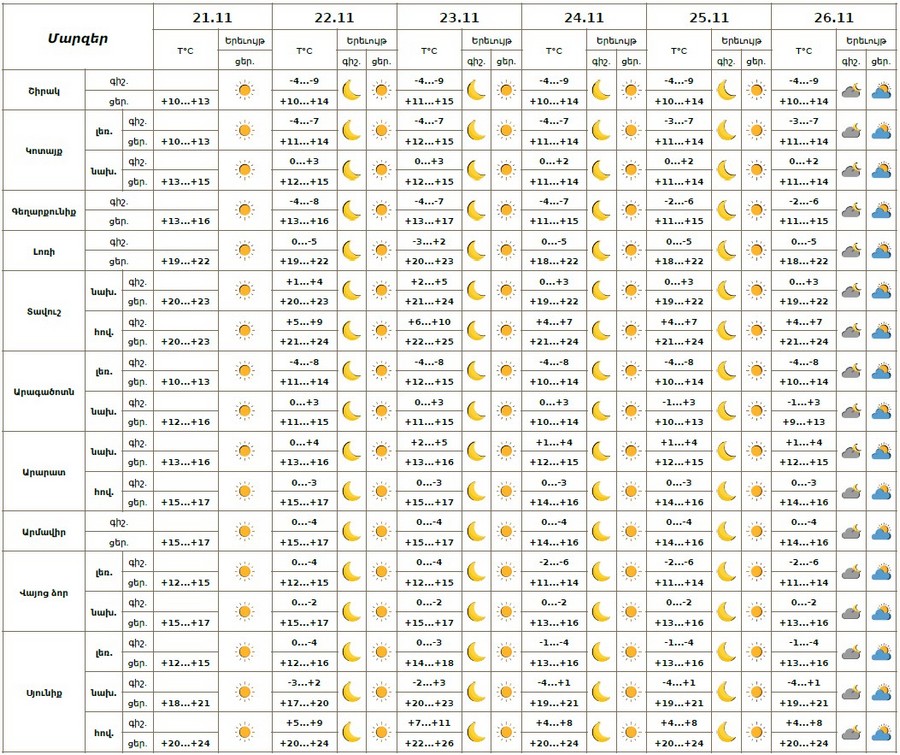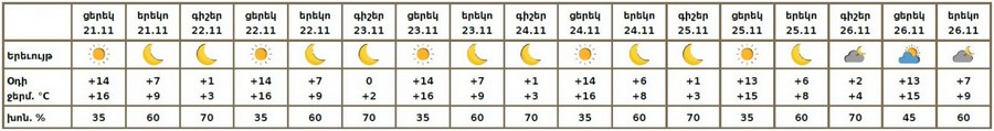Նոյեմբերի 21-ի ցերեկը, 22-26-ին սպասվում է առանց տեղումների եղանակ։