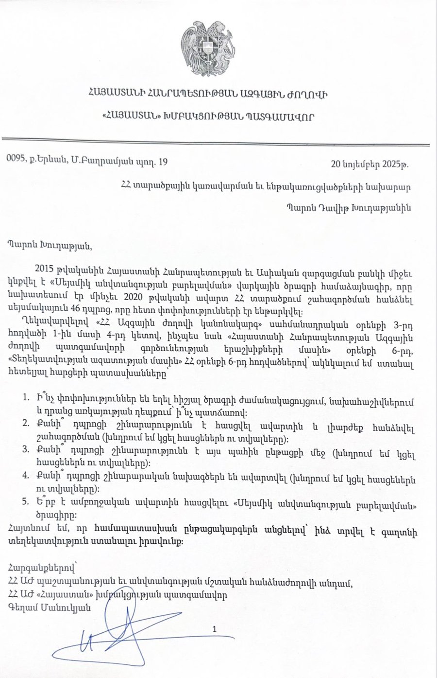 Համոզված եմ, որ ԶՈՒ, անվտանգային հարցերի հետ կապված հարցերը շոուով չեն լուծվում, ինչպես անում է այսօրվա իշխանությունը, այլ գործնական ու սրտացավ քննարկումներով, որի ապացույցներից մեկն էլ կից ներկայացված գրությունս է ուղղված պաշտպանության նախարարին, որի պատասխանն արդեն մեկ շաբաթից ավել է չկա։