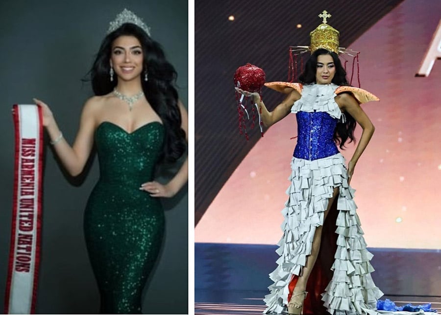Մինչդեռ «Միսս Տիեզերք 2025»-ում զգեստների այս հատվածը թատերականացված են ներկայացրել: Մենք ստացել ենք քարերի սիմֆոնիայի տեսքը, ինչին հաջորդեցին քննարկումները, թե նման չի, տգեղ է եւ այլն, ուսերին ավելացրել ենք ծիրանագույն բարձր թեւեր, որպեսզի կերպարին մարտիկի տեսք տանք, ոգեշնչվել ենք Մայր Հայաստանի արձանից՝ փորձելով ցույց տալ հայ կնոջ ուժը: Զգեստի փեշին ավելացրել ենք անմոռուկներ, օգտագործելով կապույտ գույնը՝ այդպիսով բարձրաձայնելով Հայոց ցեղասպանության մասին: Նաեւ ավելացրել ենք 12 երկաթ՝ եկեղեցու շուրջը, որոնցից կարմիր քարեր են կախվում, որպեսզի ցույց տանք այն 12 նահանգները, որոնք կորցրել ենք ցեղասպանության ժամանակ: Իսկ կարմիրը խորհրդանշում էր արյունը: Վերջում օգտագործել ենք նուռը՝ մեր հայկական միրգը: Ավելի մանրամասն գրել եմ իմ սոցիալական հարթակներում»,-պարզաբանեց Մարտուն Գեւորգյանը:
