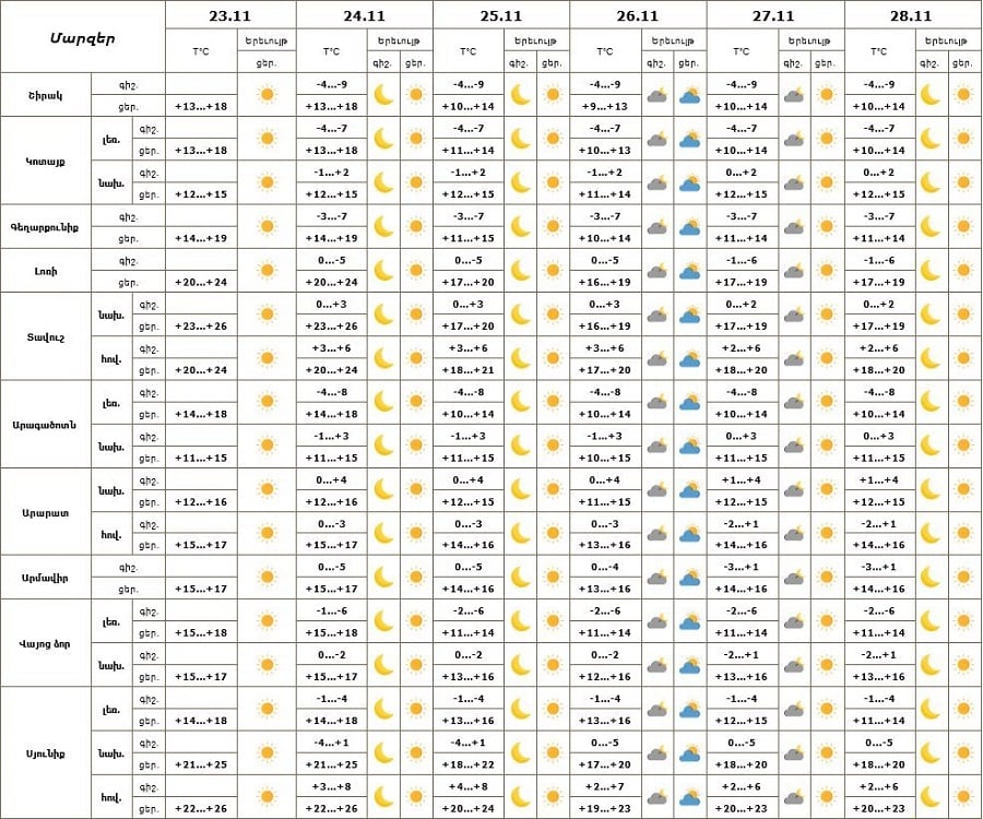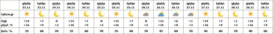 Նոյեմբերի 23-ի ցերեկը, 24-28-ը սպասվում է առանց տեղումների եղանակ։
