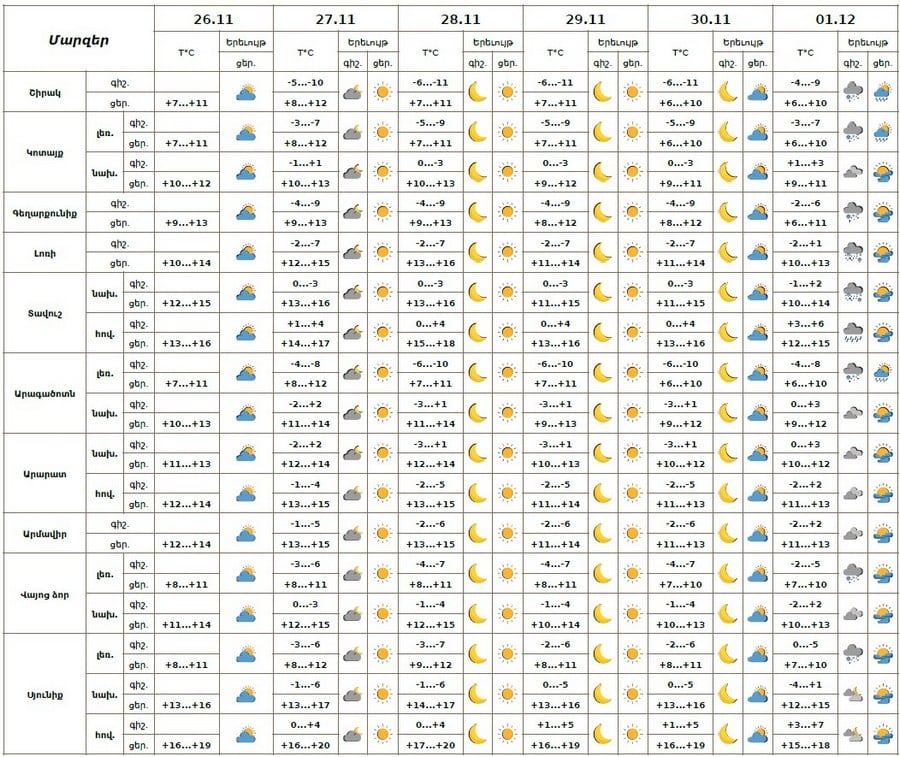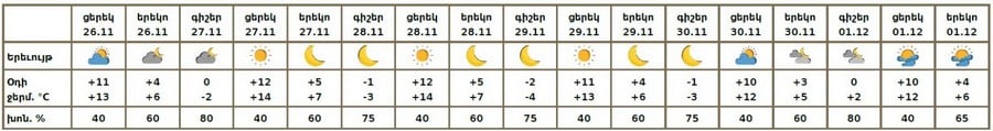 Քամին հարավարևմտյան՝ 2-5մ/վ: Օդի ջերմաստիճանը նոյեմբերի 26-ի ցերեկը կնվազի 1-2 աստիճանով, այնուհետև էապես չի փոխվի։