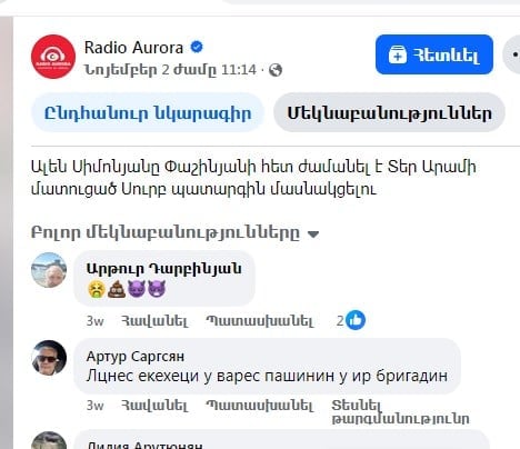 «Radio Aurora» կայքի ֆեյսբուքյան էջում նոյեմբերի 2-ին հրապարակված «Ալեն Սիմոնյանը Փաշինյանի հետ ժամանել է Տեր Արամի մատուցած Սուրբ պատարագին մասնակցելու» խորագրով տեսանյութի ներքո մեկնաբանություն թողած facebook-ի օգտատեր Արթուր Սարգսյանը նույնպես հայտնվել է իրավապահների թիրախում: