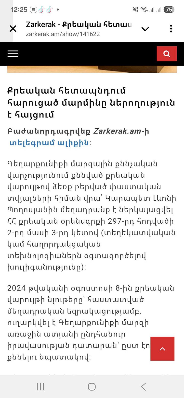 Քրեական հետապնդում հարուցած մարմինը բավարարել է նրա պահանջը․ ներողություն է խնդրել: