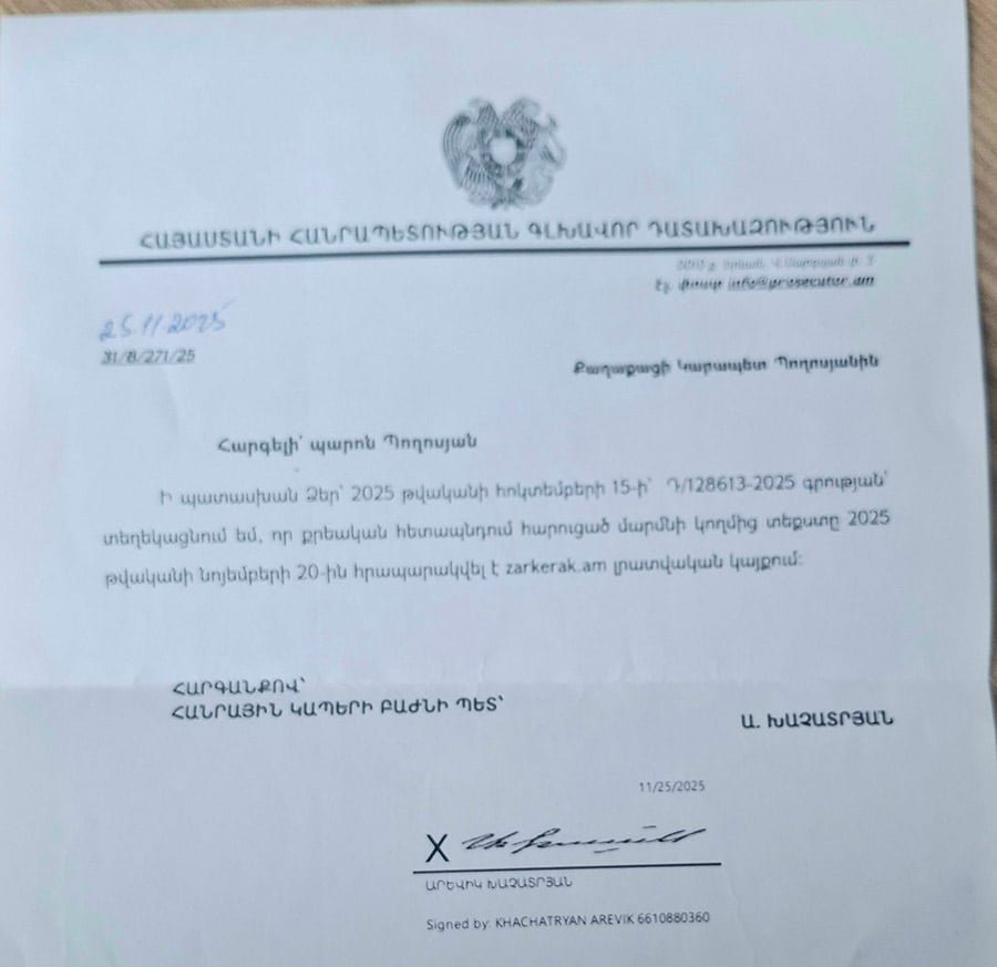 Արդարացվելուց հետո ես գլխավոր դատախազից պահանջել էի ներողություն խնդրել, բայց ինչպես նկատեցիք, իրենք իրենց կայքում նույնիսկ չէին տեղադրել, իսկ սովորաբար վարկաբեկելուց հենց իրենց կայքում են տեղադրում։ Այս անգամ անծանոթ, անհայտ կայքում էին տեղադրել․ ինձ էլ գրավոր տեղեկացրել էին այդ մասին։