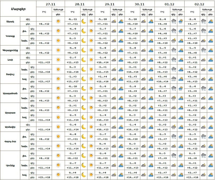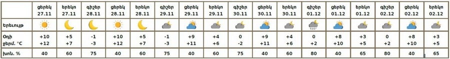 Նոյեմբերի 27-ի ցերեկը, 28-30-ին, դեկտեմբերի 2-ին սպասվում է առանց տեղումների եղանակ։
