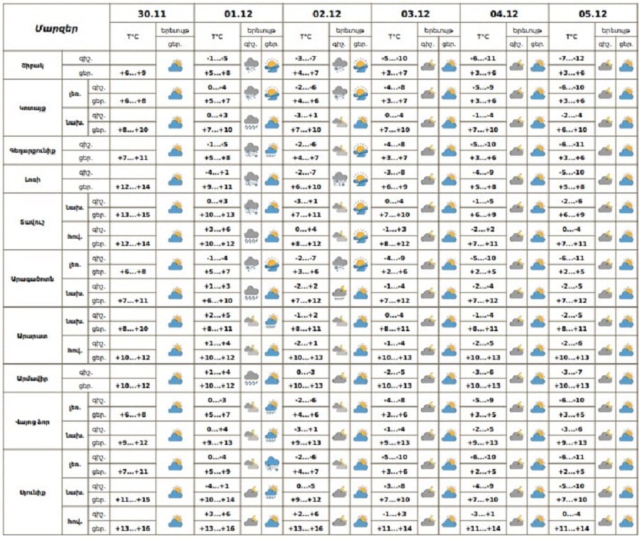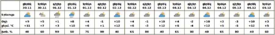 Նոյեմբերի 30-ի ցերեկը, դեկտեմբերի 3-5-ին սպասվում է առանց տեղումների եղանակ։ Դեկտեմբերի 1-ին, 2-ի գիշերը առանձին շրջաններում սպասվում են թույլ տեղումներ, լեռնային շրջաններում գիշերային ժամերին ձյան և ձնախառն անձրևի, հովտային շրջաններում՝ անձրևի տեսքով: Քամին արևմտյան՝ 2-5մ/վ: Օդի ջերմաստիճանը դեկտեմբերի 1-3-ին աստիճանաբար կնվազի 3-4 աստիճանով, Արարատյան դաշտում և նրա նախալեռներում՝ էապես չի փոխվի։