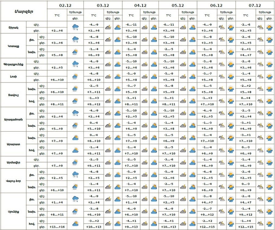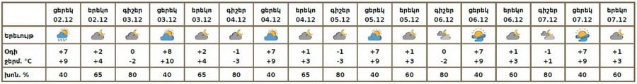 Դեկտեմբերի 2-ի ցերեկն առանձին շրջաններում սպասվում են թույլ տեղումներ, լեռնային շրջաններում ձնախառն անձրևի, հովտային շրջաններում՝ անձրևի տեսքով: Դեկտեմբերի 3-7-ին սպասվում է առանց տեղումների եղանակ։