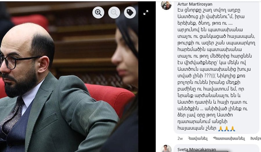 Քաղաքացին պատգամավորի նկարի տակ այսպիսի մեկնաբանություն է թողել. «Էս ցնորքը շաղ տվող աղբը Աստծուց չի՞ վախենում… իր ծնող, երեխեք, թոռ արյունով են պատասխան տալու ու ցանկացած հայասպան , թուրքի ու ազեր շան սպասարկող, հարեմածին պատասխան է տալու…Նիկոլից քոռ բոլորն ունեն իրենց բաժինը ու հավատում եմ՝ նրանք արժանանալու են եւ Աստծո դատին, եւ հայի դատ ու անեծքին»:
