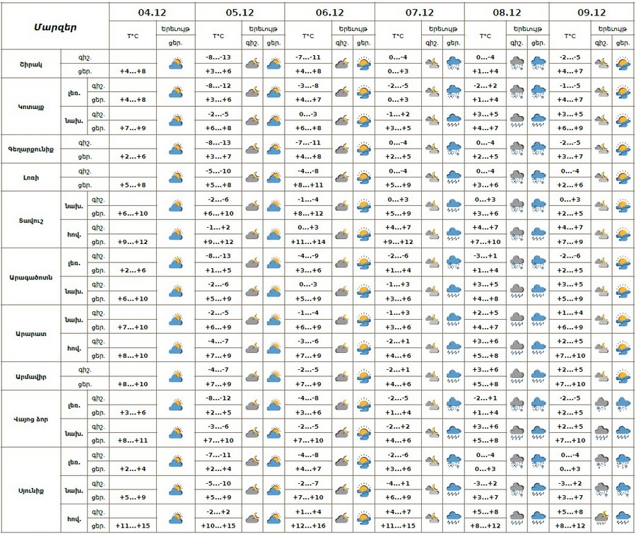 Դեկտեմբերի 4-ի ցերեկը, 5-6-ին, 7-ի գիշերը և 9-ին սպասվում է առանց տեղումների եղանակ։