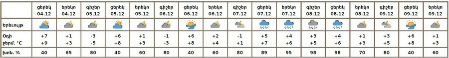 Դեկտեմբերի 4-ի ցերեկը, 5-6-ին, 7-ի գիշերը և 9-ին սպասվում է առանց տեղումների եղանակ։