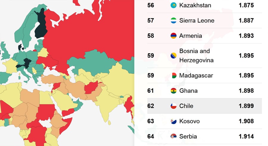 Ցանկի 58-րդ տեղում Հայաստանն է, 95-րդ տեղում՝ Ադրբեջանը, 109-րդ տեղում՝ Վրաստանը, 142-րդում՝ Իրանը, իսկ Թուրքիան զբաղեցրել է 146-րդ տեղը։