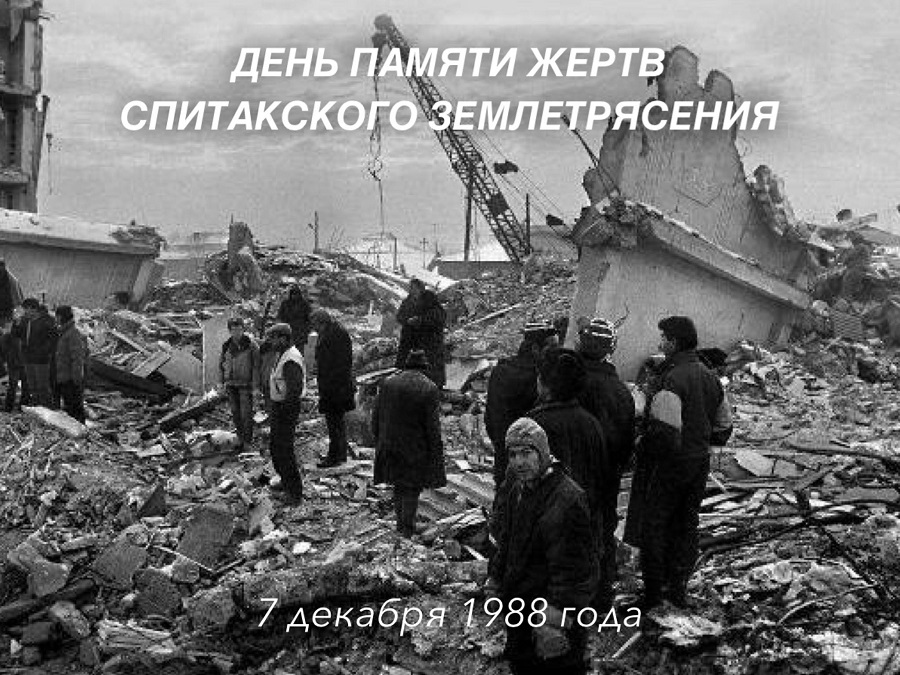 1988թ. դեկտեմբերի 7-ին Հայաստանում տեղի ունեցավ ողբերգություն, որն ընդհանուր դարձավ Խորհրդային Միության բոլոր ժողովուրդների համար: Այդ օրը հանրապետության հյուսիսում տեղի ունեցած ավերիչ երկրաշարժը, պաշտոնական տվյալներով, խլեց 25 հազար մարդու կյանք։ Տուժեցին Լենինականը (այժմ՝ Գյումրի), Կիրովականը (այժմ՝ Վանաձոր) և ավելի քան 300 բնակավայրեր, իսկ աղետի էպիկենտրոնում գտնվող Սպիտակ քաղաքը հիմնահատակ ավերվեց։ Աղետն ազդել է Հայաստանի տարածքի շուրջ 40 տոկոսի վրա։ Աղետի գոտում է հայտնվել մոտ 1 մլն մարդ։