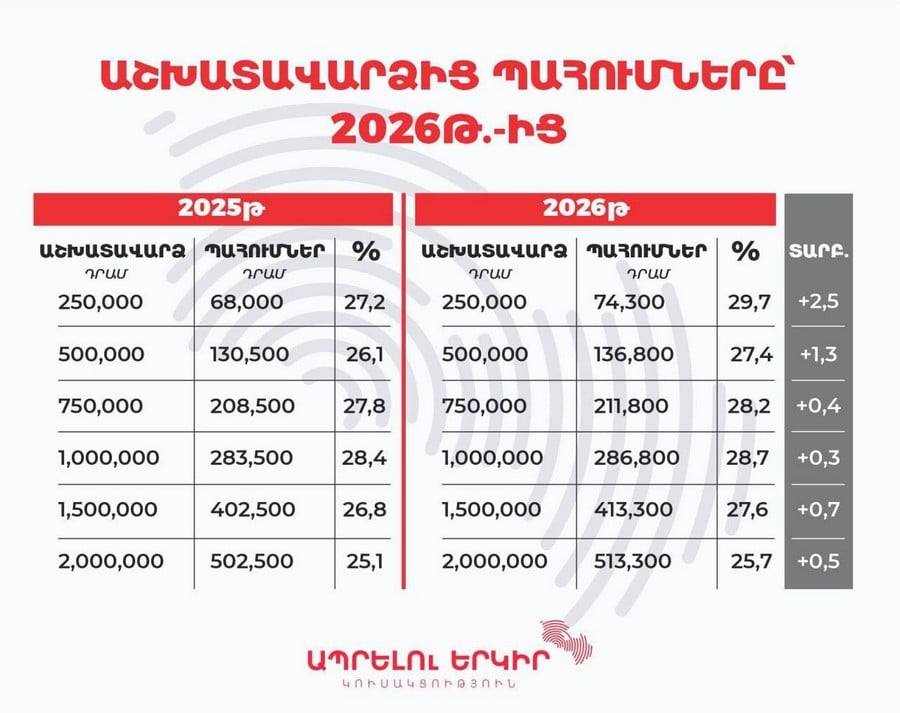 Աղյուսակում ներկայացված տարբեր աշխատավարձերի դեպքում կատարվող պահումների չափը (եկամտային հարկ, կուտակային վճար, զինապահովության վճար, առողջապահական ապահովագրության վճար) և թե դրանք ընդհանուր աշխատավարձի քանի տոկոսն են կազմում հիմա ու ինչքան մասը կկազմեն եկող տարվանից։