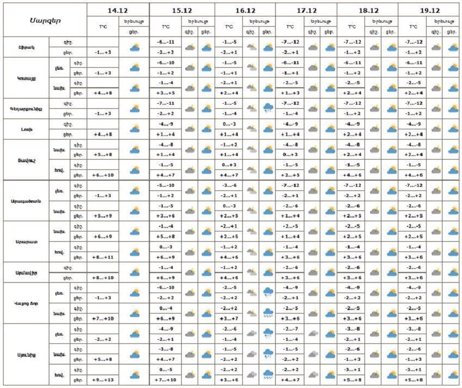 Դեկտեմբերի 14-ի ցերեկը, 15-ին, 16-ի գիշերը, 17-19-ը սպասվում է առանց տեղումների եղանակ։ Դեկտեմբերի 16-ի ցերեկն առանձին շրջաններում սպասվում են տեղումներ։ Դեկտեմբերի 17-19-ը Արարատյան և Շիրակի դաշտի ցածրադիր հատվածներում առավոտյան ժամերին սպասվում է մառախուղ։