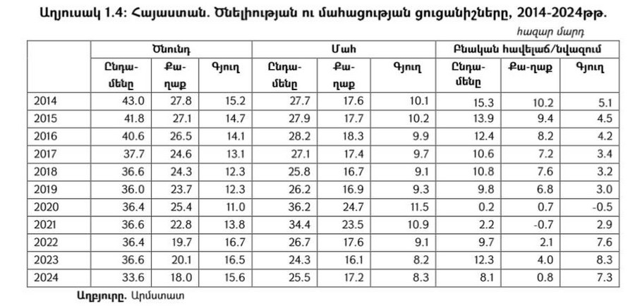 2024 թվականի պաշտոնական վիճակագրությունը խիստ մտահոգիչ է, մասնավորապես` ծնունդների թիվը նվազել է` հասնելով 33600-ի, իսկ մահացության թիվը աճել է` հասնելով 25500: