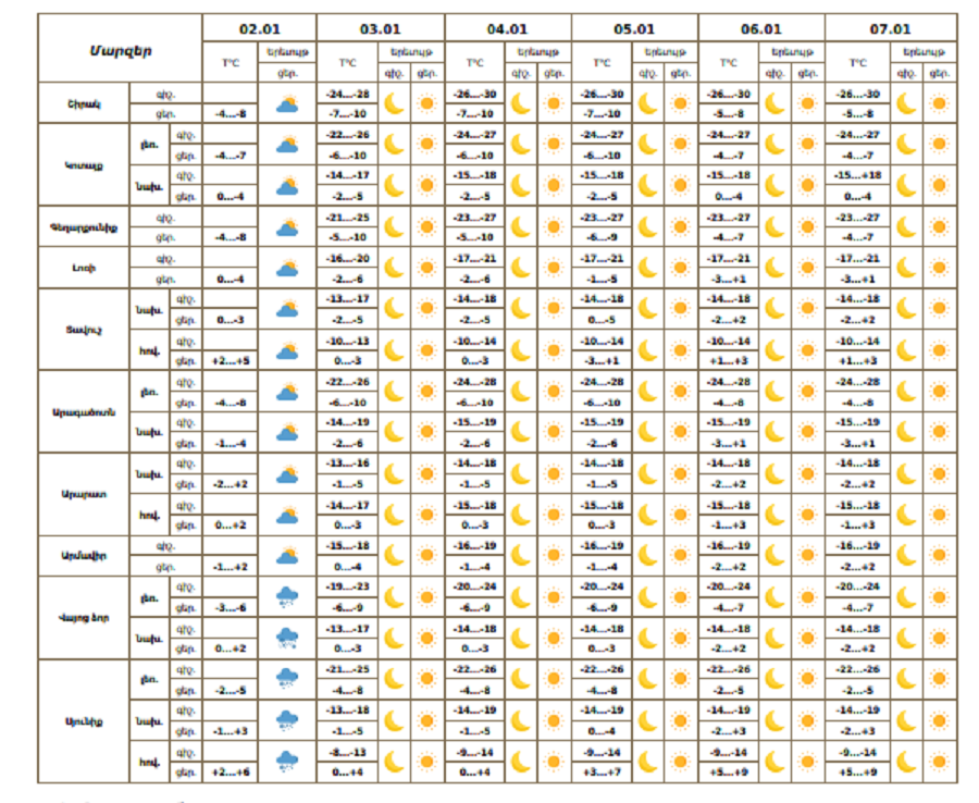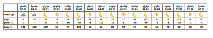 Հունվարի 2-ի ցերեկը՝ Վայոց ձորում և Սյունիքում սպասվում է ձյուն, առանձին հատվածներում՝ զգալի: Հունվարի 3-7-ին սպասվում է առանց տեղումների եղանակ։ Քամին հյուսիսարևմտյան՝ 2-5մ/վ, հունվարի 2-ցերեկը, լեռնային մարզերի առանձին գոտիներում սպասվում է նաև քամու ուժգնացում՝ 17-20մ/վրկ, բուք, ցածր հորիզոնական տեսանելիություն։ Օդի ջերմաստիճանը հունվարի 3-4-ին հանրապետության ողջ տարածքում գիշերը կնվազի 14-18 աստիճանով։
