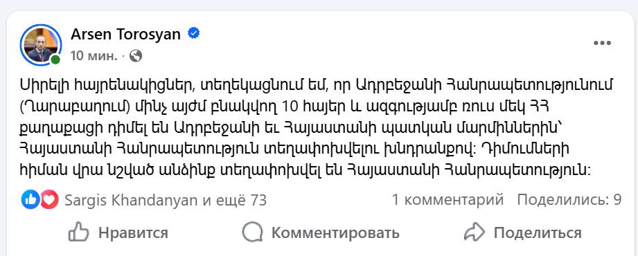 «Սա Հայաստանի սոցիալական ապահովության նախարարն է, որը պատասխանատու է, ի թիվս այլնի, Արցախից փախստականների խնդիրների համար, որոնցից առանցքայինը ցեղասպանություն վերապրած մարդկանց ծանր հոգեբանական վիճակն է: Եվ հատկապես նա է նախընտրում է աղ ցանել բաց վերքի վրա՝ Ղարաբաղն Ադրբեջան անվանելով վերջին 10 հայերին հայրենիքից զրկվելու վերաբերյալ իր ֆեյսբուքյան գրառմամբ»: