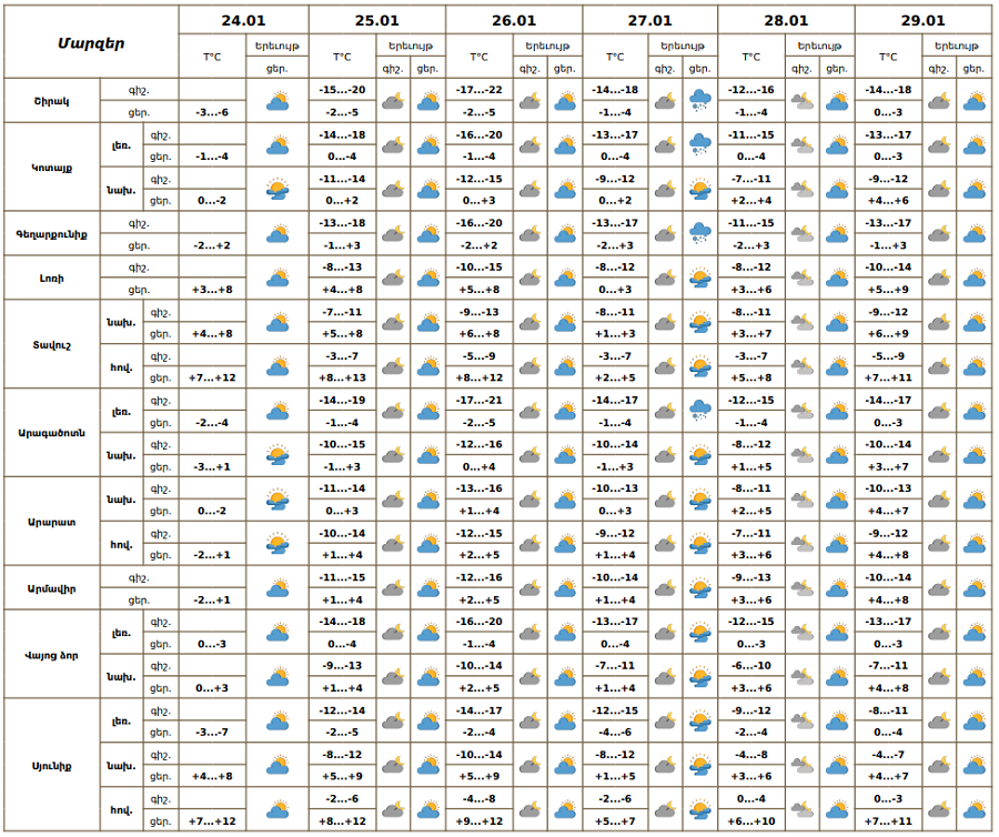 Հունվարի 24-ի ցերեկը, 25-26-ին, 27-ի գիշերը, 28-29-ին սպասվում է առանց տեղումների եղանակ։ Հունվարի 27-ի ցերեկն առանձին շրջաններում սպասվում է ձյուն, լեռնային շրջաններում՝ բուք, ցածր հորիզոնական տեսանելիություն։ Քամին` հարավարևմտյան` 2-5մ/վ, հունվարի 24-ի ցերեկն առանձին շրջաններում սպասվում է նաև քամու ուժգնացում՝ 10-13մ/վ, լեռնային առանձին հատվածներում՝ բուք։ Հունվարի 25-29-ի առավոտյան ժամերին Արարատյան և Շիրակի դաշտի ցածրադիր հատվածներում սպասվում է մառախուղ։ Օդի ջերմաստիճանը հունվարի 24-26-ի ցերեկային ժամերին աստիճանաբար կբարձրանա 2-5 աստիճանով։