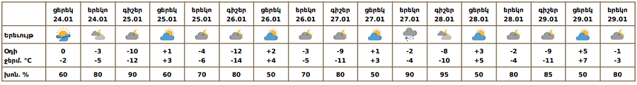 Հունվարի 24-ի ցերեկը, 25-29-ին սպասվում է առանց տեղումների եղանակ: Հունվարի 27-ի երեկոյան հնարավոր է ձյուն։