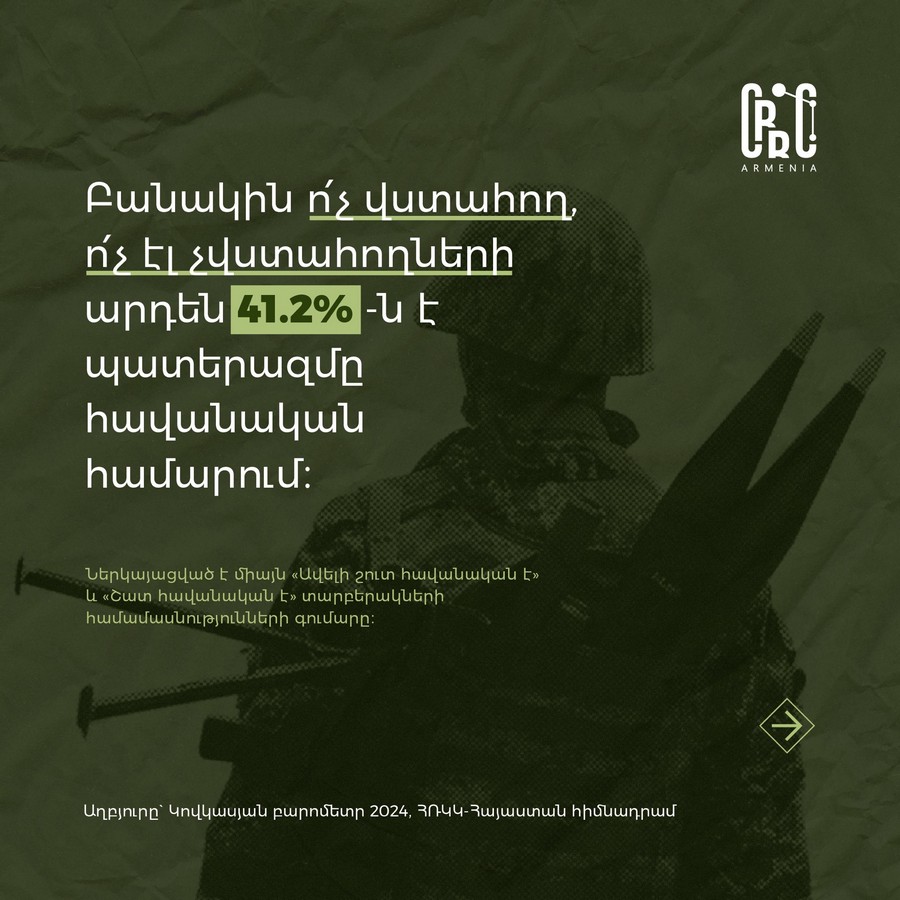 Այսօրվա առթիվ մենք փորձեցինք ստուգել` ինչ են հուշում մեր Կովկասյան բարոմետրի տվյալները։ Դրանց համադրումից պարզ է դառնում, որ բանակին վստահողները, ի տարբերություն չվստահողների, ունեն ավելի կայուն և հանգիստ անվտանգային ընկալումներ՝ ավելի պակաս հավանական են համարում, որ Հայաստանը կներքաշվի որևէ պատերազմի մեջ։