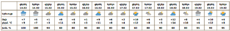 Փետրվարի 14-ի ցերեկը շրջանների զգալի մասում, 15-ի և 18-ի գիշերը, 19-ին առանձին շրջաններում սպասվում են տեղումներ․ նախալեռնային և հովտային շրջաններում՝ անձրևի և ձնախառն անձրևի, լեռնային շրջաններում՝ ձյան տեսքով։ Լեռնային առանձին շրջաններում սպասվում է նաև բուք, ցածր հորիզոնական տեսանելիություն։ Փետրվարի 15-ի ցերեկը, 16-17-ին, 18-ի ցերեկը սպասվում է առանց տեղումների եղանակ։ Քամին` հարավարևմտյան`3-6մ/վ, առանձին շրջաններում սպասվում է նաև քամու ուժգնացում․ փետրվարի 14-ի ցերեկը, 17-19-ին՝ 18-22մ/վ, 15-16-ին՝ 13-16մ/վ արագությամբ։ Օդի ջերմաստիճանը փետրվարի 14-ի ցերեկը, 15-18-ին ողջ հանրապետությունում աստիճանաբար կբարձրանա ևս 3-5 աստիճանով։