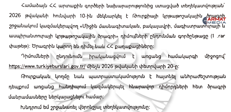 Armat Media-ին բուհերի ռեկտորներից մեկը տրամադրել է Գիտության կոմիտեի նախագահ Սարգիս Հայոցյանի շրջաբերականը, որով առաջարկվում է հայ ուսանողներին մասնակցել Թուրքիայի կրթաթոշակային ծրագրին: