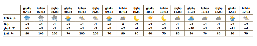 Մարտի 7-ի ցերեկը, 8-ի գիշերը և առավոտյան սպասվում են տեղումներ ձնախառն անձրևի և անձրևի տեսքով։ Մարտի 8-ի ցերեկը, 9-12-ին սպասվում է առանց տեղումների եղանակ։