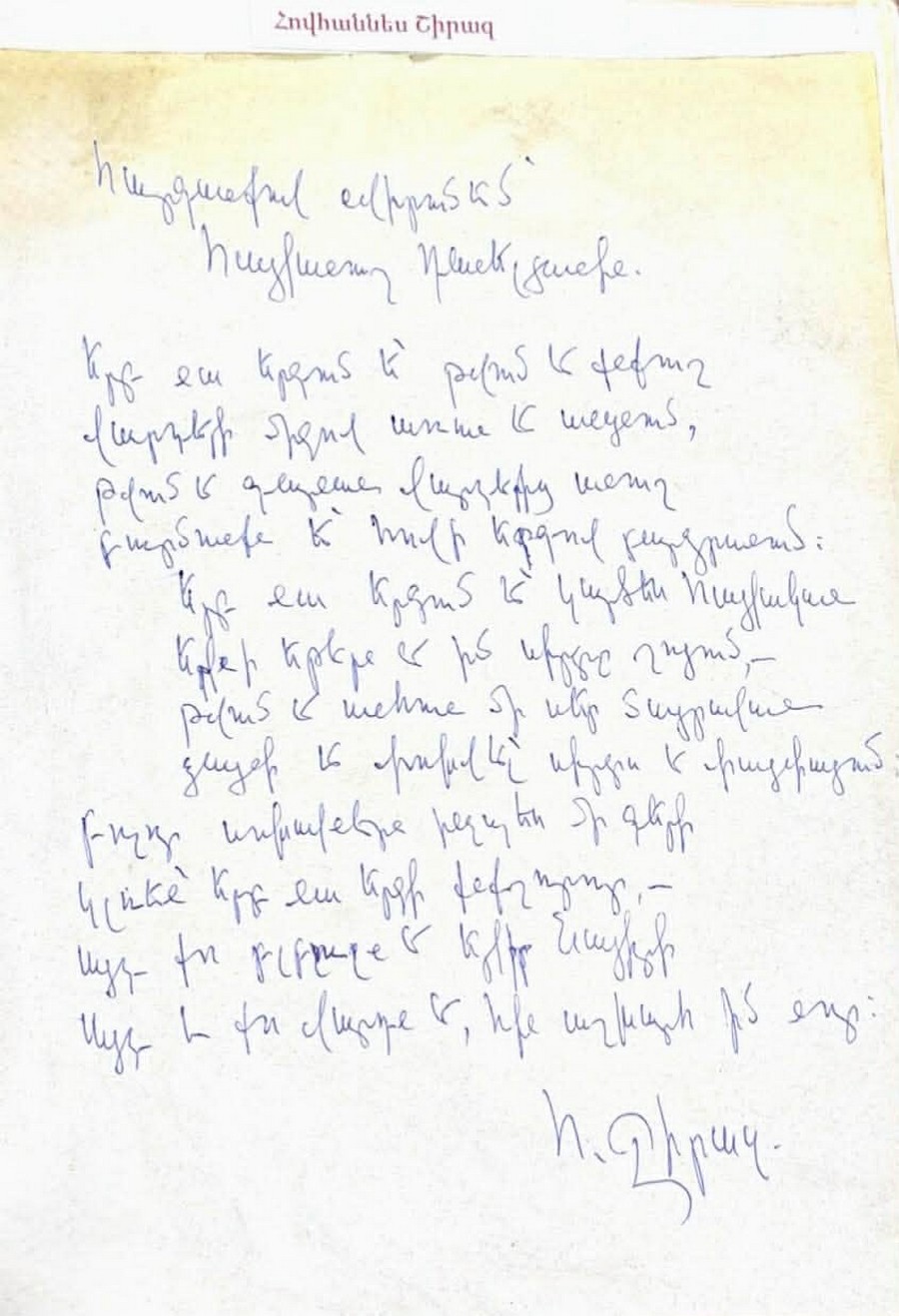 Հայկական բնօրինակ ձեռագրերի, անձնական նամակների մեջ են Հովհաննես Թումանյանի մոտ քսան ձեռագրերը (ի դեպ, բանաստեղծի աղջկա՝ Նվարդի ձեռագիրը Պոետն ուներ, բայց թանգարանում ճշտվեց, որ իմ ներկայացրածը Պոետինն է, ասում է զրուցակիցս-Ռ. Մ.), Ավետիք Իսահակյանի, Հովհաննես Շիրազի, Երվանդ Քոչարի, Եղիշե Չարենցի, Աթաբեկ Խնկոյանի՝ Խնկո-Ապոր, Պարույր Սեւակի, Սիլվա Կապուտիկյանի, Մարտիրոս Սարյանի, Փափազյանի, Արմեն Խոստիկյանի, Սվետլանա Գրիգորյանի, Ռոզի Արմենի…