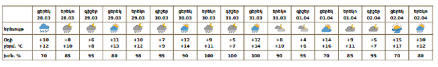 Մարտի 28-ի ցերեկը, 29-31-ին, ապրիլի 2-ի ցերեկը ժամանակ առ ժամնակ շրջանների զգալի մասում սպասվում են տեղումներ. լեռնային գոտիներում՝ թաց ձյան, նախալեռնային և հովտային գոտիներում՝ անձրևի տեսքով։ Ապրիլի 1-ին, 2-ի գիշերը սպասվում է առանց տեղումների եղանակ։ Քամին` հարավարևմտյան` 2-5 մ/վ, մարտի 28-ի ցերեկն առանձին շրջաններում սպասվում է նաև քամու ուժգնացում 14-17մ/վ արագությամբ: Օդի ջերմաստիճանն էապես չի փոխվի։