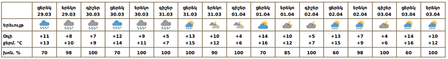 Մարտի 29-ի ցերեկը, 30-ին, ապրիլի 2-ի և 3-ի ցերեկը ժամանակ առ ժամանակ շրջանների զգալի մասում, 31-ին՝ առանձին շրջաններում սպասվում են տեղումներ. լեռնային գոտիներում՝ գիշերը՝ ձյան, ցերեկը՝ թաց ձյան, նախալեռնային և հովտային գոտիներում՝ անձրևի տեսքով։ Ապրիլի 1-ին, 2-ի և 3-ի գիշերը սպասվում է առանց տեղումների եղանակ։ Քամին` հարավարևմտյան` 2-5 մ/վ, մարտի 30-ի ցերեկն առանձին շրջաններում սպասվում է նաև քամու ուժգնացում 14-17մ/վ արագությամբ: Օդի ջերմաստիճանն էապես չի փոխվի։