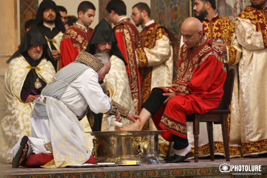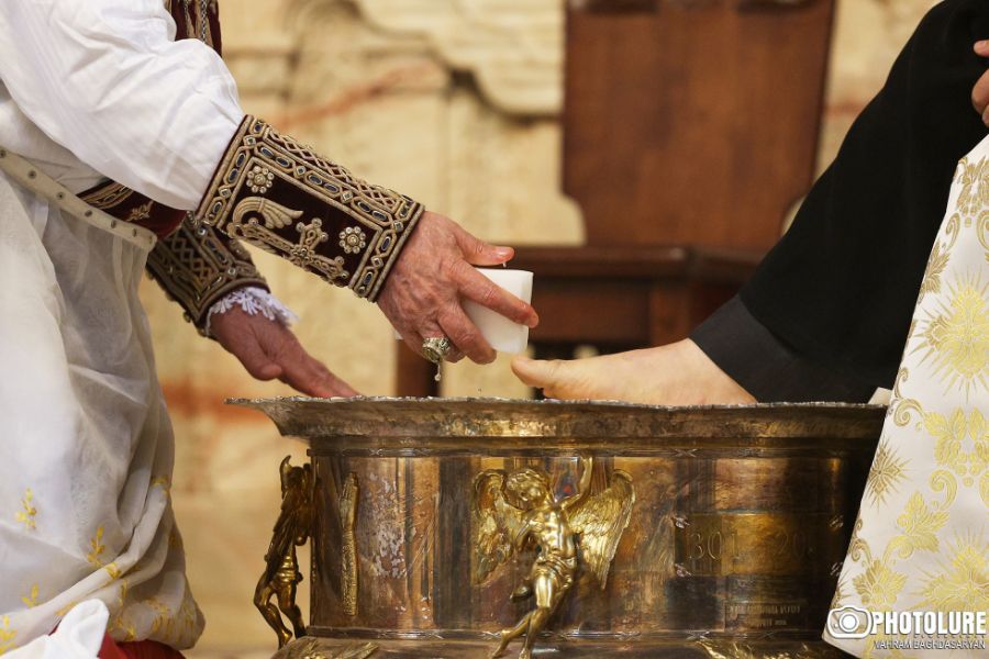 Ապա շարականների երգեցողության ներքո, Աստվածորդու օրինակով Նորին Սրբությունը ծնրադիր լվաց և յուղով օծեց Մայր Աթոռի միաբաններ՝ Տ. Հայկազուն արեպիսկոպոս Նաջարյանի, Տ․ Հովհաննես աբեղա Թորգոմյանի, Տ․ Մաշտոց աբեղա Մխիթարյանի, Արամայիս սարկավագ Ազիզյանի, Սերգեյ սարկավագ Բարսեղյանի, Սևանի Վազգենյան Հոգևոր Դպրանոցի Ե լսարանի սան Ալեն ուրարակիր Իսրայելյանի և Ա լսարանի սան Աբրահամ Հովհաննիսյանի, «Էօրնեկյան» հանրակրթական դպրոցի աշակերտներ Արտաշես Ղազարյանի, Կամսար Մարտիրոսյանի, ինչպես նաև Հայաստանի և սփյուռքի տարբեր համայնքներից հայորդիներ Վահագն Սահակյանի, Մոնթե Լևոն և Սերոբ Իշխան Եգիներյանների, Նարեկ Ղևոնդյանի, Դավիթ Մարտիրոսյանի, Ստեփան Սկրտչյանի, Նարեկ Տերտերյանի, Սարգիս Քոչարյանի և Լևոն Շարոյանի ոտքերը։