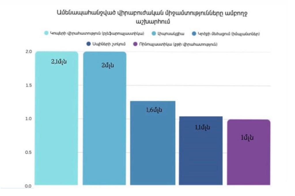 International Society of Aesthetic Plastic Surgery-ի 2024 թ․-ի տվյալներով՝ ամբողջ աշխարհում ամենատարածված պլաստիկ միջամտություններն են կոպերի վիրահատությունը (2,115,360), լիպոսակցիան (2,087,189), կրծքերի մեծացումը (1,658,615), սպիների շտկումը (1,156,446) և ռինոպլաստիկան՝ քթի վիրահատությունը (1,083,631)։