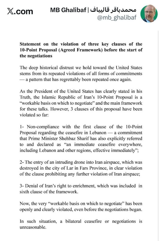 Նման իրավիճակում երկկողմ հրադադարը կամ բանակցություններն անտրամաբանական են», հայտարարել է խորհրդարանի խոսնակ Մոհամմադ Բաղեր Ղալիբաֆը։