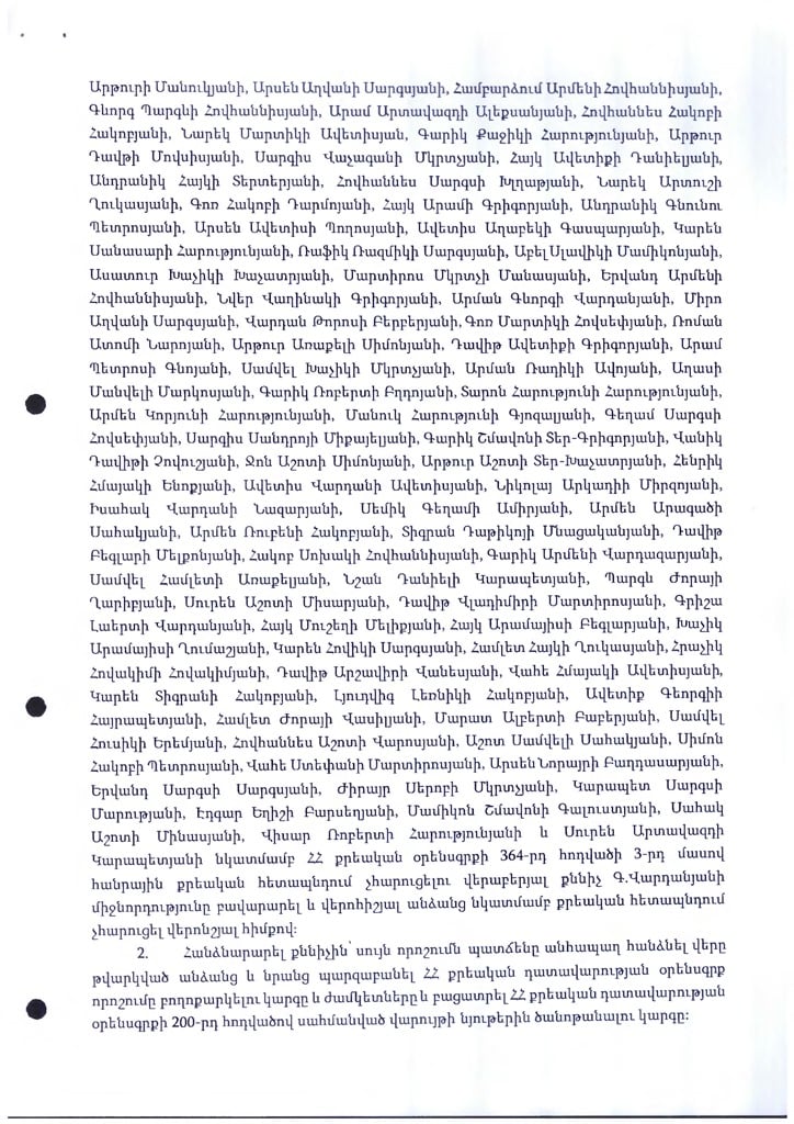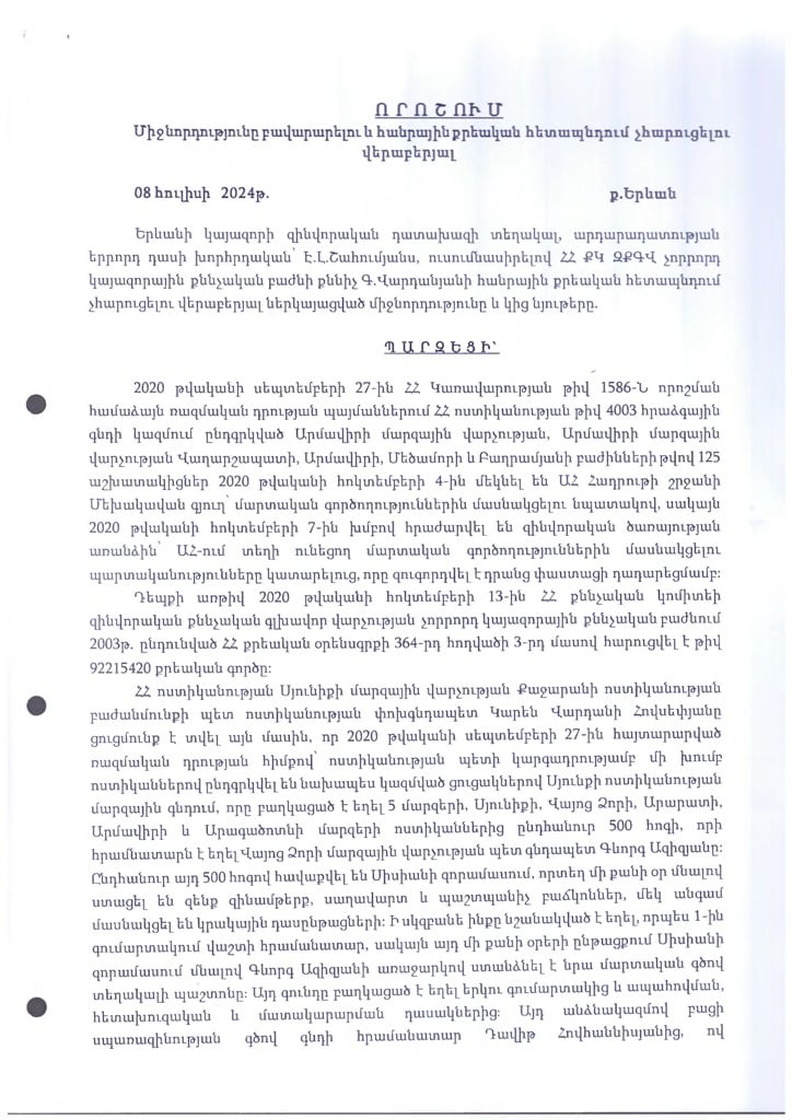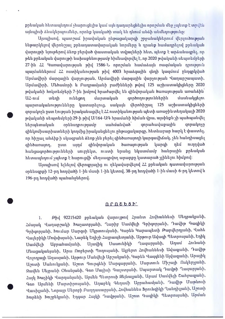 Համապատասխան որոշման մեջ նշվում է, որ նրանք 2020 թվականի հոկտեմբերի 4-ին մեկնել են ԱՀ Հադրութի շրջանի Մեխակավան գյուղ՝ մարտական գործողություններին մասնակցելու նպատակով, սակայն հոկտեմբերի 7-ին խմբով հրաժարվել են զինվորական ծառայության առանձին՝ ԱՀ-ում տեղի ունեցող մարտական գործողություններին մասնակցելու պարտականությունները կատարելուց, որը զուգորդվել է դրանց փաստացի դադարեցմամբ:
