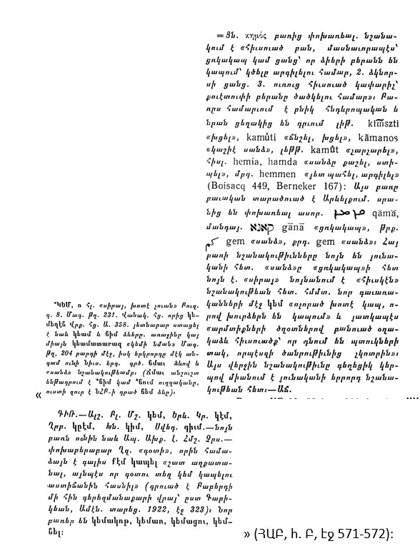 [7] Հ. Աճառյան, Հայերեն արմատական բառարան (այսուհետև՝ ՀԱԲ), հ. Բ, Ե., 1973, էջ 487: