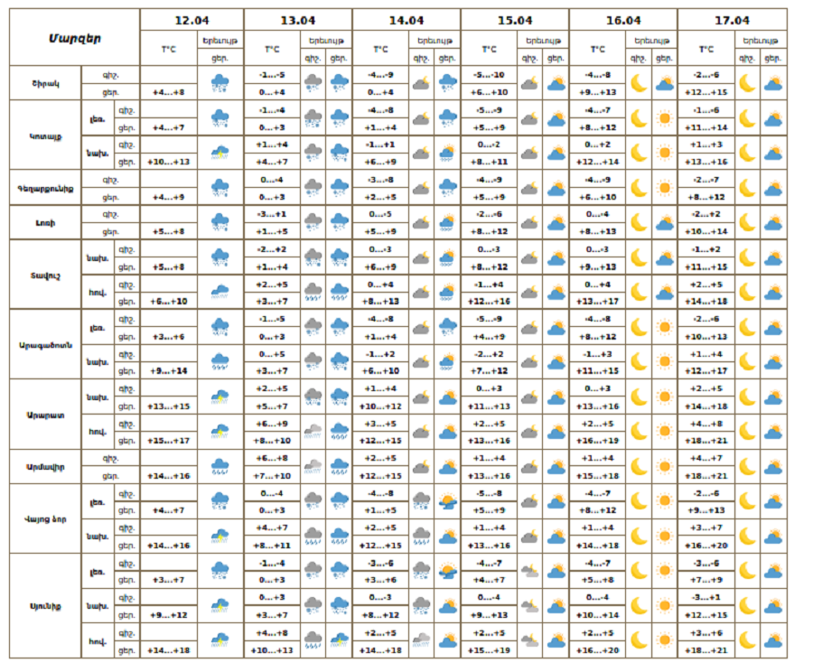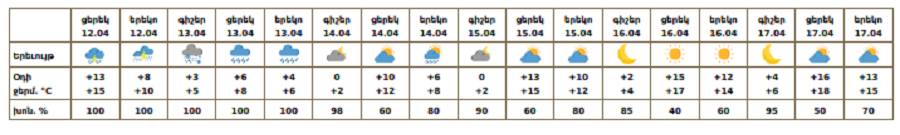Ապրիլի 12-ի ցերեկը, 13-ին ժամանակ առ ժամանակ շրջանների զգալի մասում, 14-ին առանձին շրջաններում սպասվում են տեղումներ. առանձին վայրերում՝ առատ։ Տեղումները ապրիլի 13-ին լեռնային և բոլոր նախալեռնային գոտիներում կդիտվեն ձյան, հովտային գոտիներում՝ անձրևի տեսքով։ Առանձին վայրերում սպասվում է ամպրոպ։ Ապրիլի 15-17-ին սպասվում է առանց տեղումների եղանակ։ Քամին` հարավարևմտյան` 2-5 մ/վ: Օդի ջերմաստիճանն ապրիլի 13-ի ցերեկը և 14-ի գիշերը կնվազի 5-7 աստիճանով, ապրիլի 15-17-ին հատկապես ցերեկային ժամերին աստիճանաբար կբարձրանա 9-13 աստիճանով։