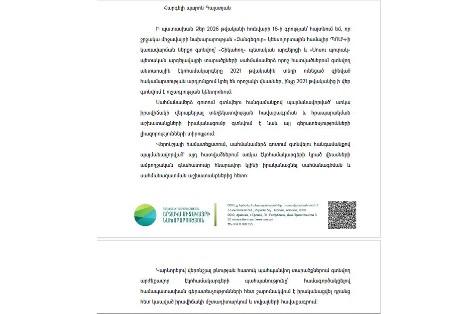 պետական արգելավայրի տարածքների սահմանամերձ որոշ հատվածներում գտնվող ͟ա͟ն͟տ͟ա͟ռ͟ա͟յ͟ի͟ն͟ ͟է͟կ͟ո͟հ͟ա͟մ͟ա͟կ͟ա͟ր͟գ͟ե͟ր͟ը͟ 2021 թ տեղի ունեցած ͟զ͟ի͟ն͟վ͟ա͟ծ͟ ͟հ͟ա͟կ͟ա͟մ͟ա͟ր͟տ͟ո͟ւ͟թ͟յ͟ա͟ն͟ ͟ա͟ր͟դ͟յ͟ո͟ւ͟ն͟ք͟ո͟ւ͟մ͟ ͟կ͟ր͟ե͟լ͟ ͟ե͟ն͟ ͟ո͟ր͟ո͟շ͟ա͟կ͟ի͟ ͟վ͟ն͟ա͟ս͟ն͟ե͟ր͟…»: