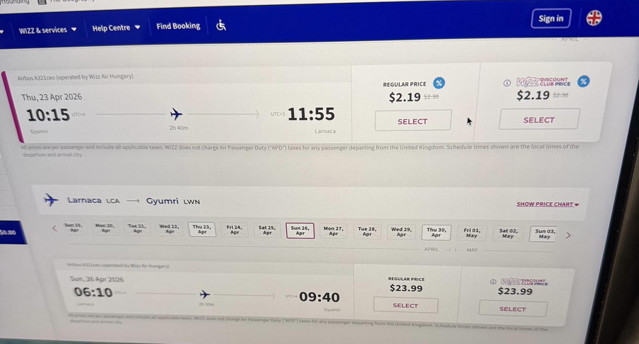 «Կիրակի օրվա համար դեպի Լառնակա 2 եվրոյով տոմս կա, 900 դրամով Գյումրի-Լառնակա ավիատոմս կա։ Այսինքն՝ ապրիլի մեկից մեր բարձրացրած թոշակով թոշակառուն կարա 5 հատ տուդա-աբրատնի տոմս առնի»,- ԱԺ-կառավարություն հարցուպատասխանի ժամանակ ասաց Նիկոլ Փաշինյանը։