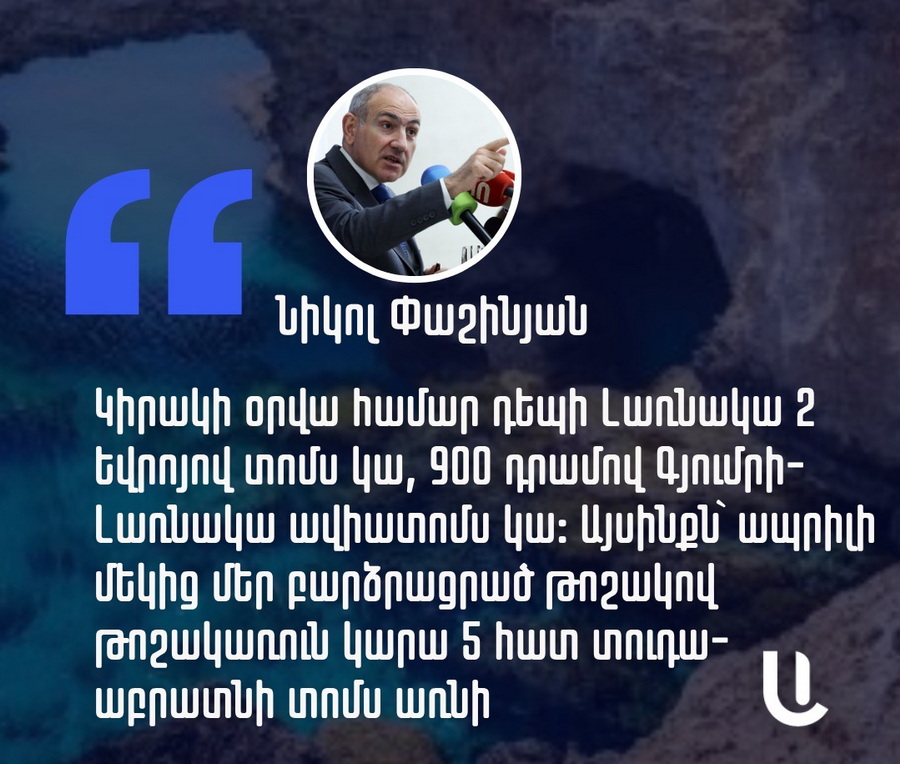 Երեկ Ազգային ժողովում կառավարության հետ հարցուպատասխանի ժամանակ Հայաստանի կառավարության ղեկավարը, երկրի թիվ 1 պաշտոնյան ասաց. «Խոսում էինք ավիատոմսերի գների մասին՝ 15-20 եվրո, էս ընթացքում ինձ ուղարկեցին սքրինշոթեր, որ կիրակի օրվա համար 2 եվրոյով տոմս կա Լառնակա: Այսինքն` մեր թոշակառուները 900 դրամով Գյումրի-Լառնակա ավիատոմս կա, խոսքը երկկողմանիի մասին ա, չէ՞, չէ՞, ա դե համը հանում են (ծիծաղում է-խմբ.), լավ, միակողմանի, այսինքն՝ ապրիլից մեր բարձրացրած թոշակով թոշակառուն կարա 5 հատ տուդա աբրատնը տոմս առնի»: