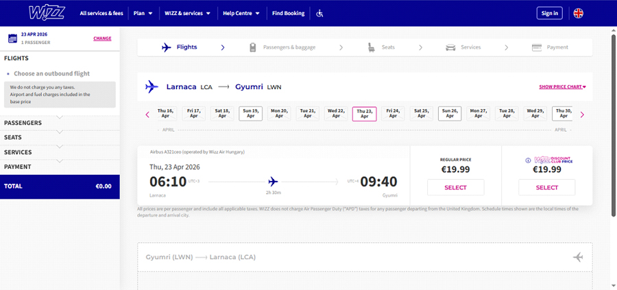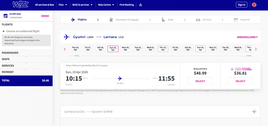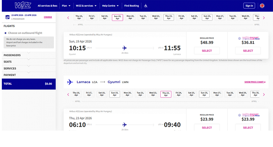 Ինչ վերաբերում է վարչապետի այն հայտարարությանը, թե ապրիլից իրենց բարձրացրած թոշակի մասով (խոսքը 10 հազար դրամի մասին է) հնարավոր է հինգ հատ երկկողմանի տոմս գնել, ապա դա բացարձակապես չի համապատասխանում իրականությանը, քանի որ երբեք մի կողմի արժեքը չի նշանակում, որ հետադարձն էլ նույն գինն ունի: Ինչպես տեսնում եք ներքեւի սքրինշոթում՝ Լառնակայից դեպի Գյումրի ամենամոտ ժամանակում հետադարձը՝ ապրիլի 23-ին, կարժենա 24 դոլար: Երեկ, երբ Գյումրի-Լառնակա տոմսն արժեր 2 դոլար, Լառնակայից վերադարձն արժեր 20 դոլար: Այսինքն՝ անգամ երեկվա չափազանց մատչելի գներով երկկողմանի տոմսը դեպի Լառնակա արժեր 22 դոլար (մոտ 8300 դրամ), այսինքն՝ միայն մի հոգու համար կարելի էր գնել տոմս 10 հազար դրամով, իսկ այսօր արդեն այդ երկկողմանի տոմսն արժե 73 դոլար (մոտ 28 000 դրամ):