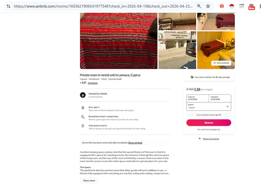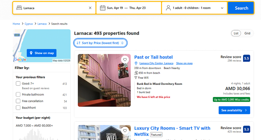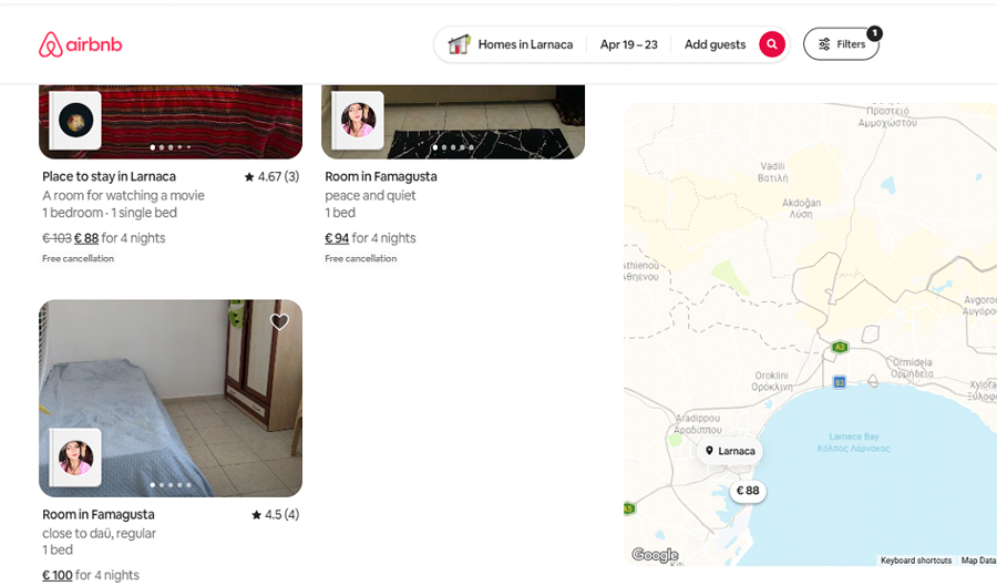 Եվ վերջապես՝ ի՞նչ է նշանակում որեւէ տեղ մեկնելը: Դու չես կարող որեւէ ճամփորդություն պլանավորել՝ միայն տոմսի գնի մասին մտածելով: Պետք է մտածել նաեւ տվյալ վայրում գիշերակացի եւ սննդի մասին: Ամենահայտնի երկու հարթակներում՝ booking-ում եւ airbnb-ում փնտրեցինք Լառնակայի ամենաէժան կացարանները՝ ապրիլի 19-23-ը: