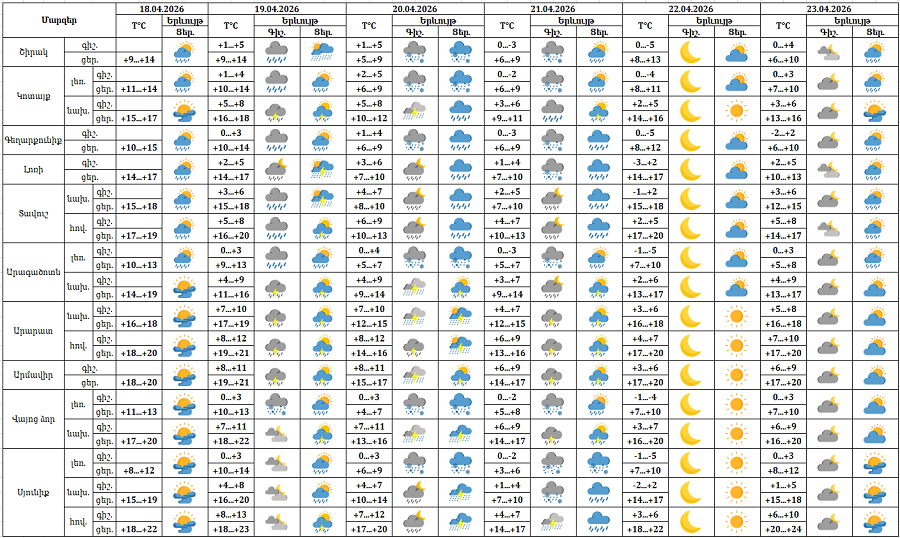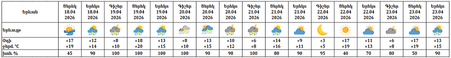 Ապրիլի 18-ին կեսօրից հետո հնարավոր է կարճատև անձրև։ Ապրիլի 19-21-ին ժամանակ առ ժամանակ, 23-ին կեսօրից հետո սպասվում է անձրև և ամպրոպ, ապրիլի 20-ին՝ ինտենսիվ։ ամպրոպի ժամանակ՝ քամու ուժգնացում մինչև 15-18մ/վ արագությամբ։ Ապրիլի 22-ին, 23-ի գիշերը սպասվում է առանց տեղումների եղանակ։