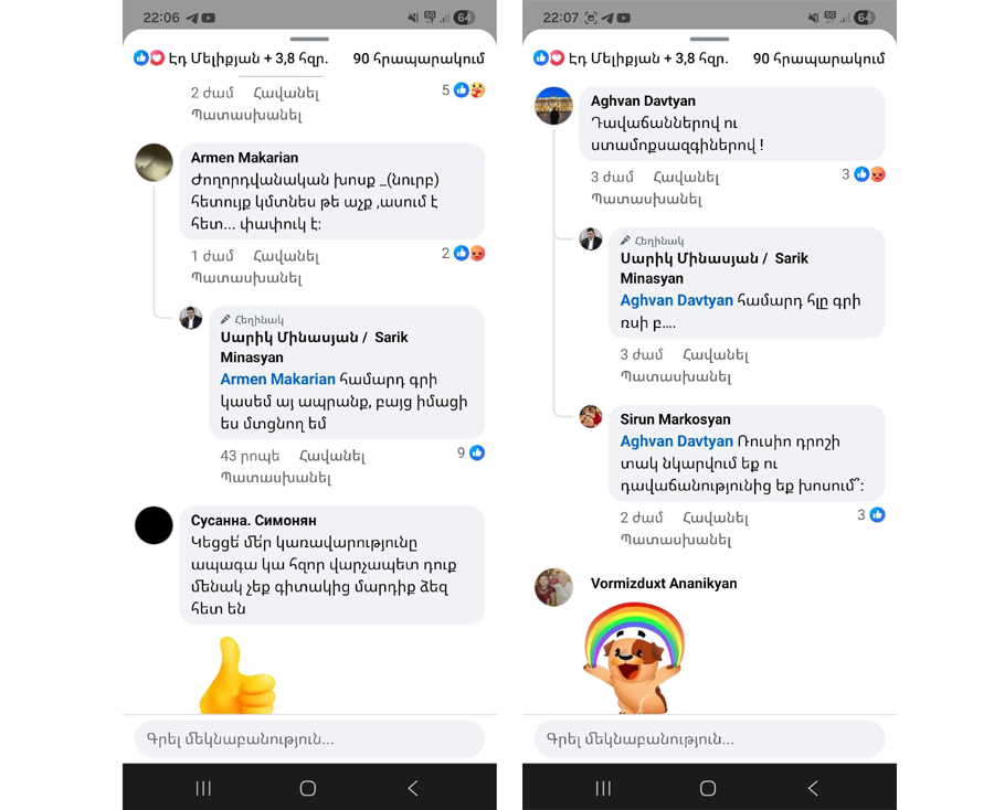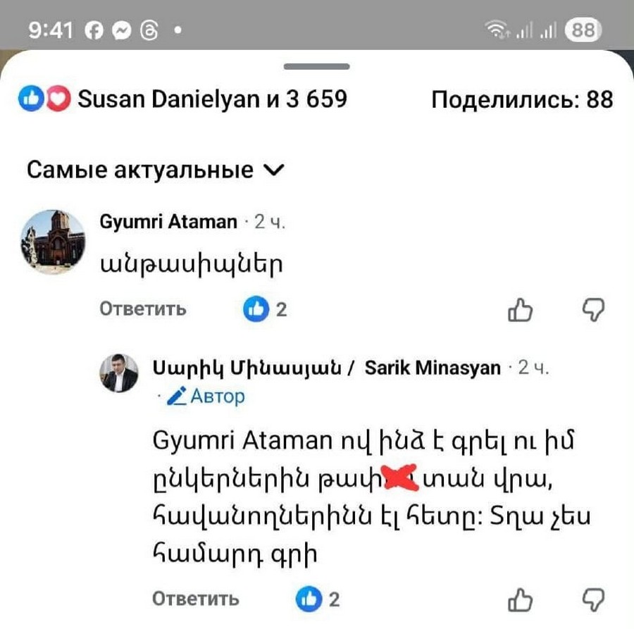 «Ես՝ որպես Մարդու իրավունքների պաշտպան, չեմ կարող գովերգել որեւէ խոսքի տեսակ, որը խոսքի ազատության իրավաչափ սահմաններից դուրս է գտնվում։ Եվ այս տեսանկյունից մշտապես բոլոր դերակատարներին, այդ թվում՝ իշխող կուսակցության առումով ես մշտապես բարձրաձայնել եմ խնդիրը։ Կոչ եմ անում բոլոր քաղաքական դերակատարներին՝ ընդհանրապես զերծ մնալ թե ատելության խոսքից, թե վիրավորանք պարունակող խոսքից»,- Ազգային ժողովում լրագրողների հետ ճեպազրույցում ասաց ՄԻՊ Անահիտ Մանասյանը՝ անդրադառնալով հարցին, որ Գյումրու ավագանու ՔՊ խմբակցության ղեկավար Սարիկ Մինասյանը համացանցում հայհոյել էր քաղաքացուն, այնուհետեւ ներողություն խնդրել։