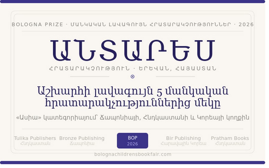 Հայկական «Անտարես» հրատարակչությունը ընդգրկվել է Bologna Prize for the Best Children’s Publishers of the Year 2026 (Բոլոնիայի մրցանակ՝ տարվա լավագույն մանկական հրատարակիչների համար, BOP) մրցանակի կարճ ցուցակում, որը մանկական գրահրատարակչության ոլորտի ամենահեղինակավոր միջազգային պարգևներից մեկն է։ Սա կարևոր ձեռքբերում է ոչ միայն հրատարակչության, այլև ամբողջ Հայաստանի համար՝ որպես հարուստ գրական ավանդույթ և աճող միջազգային մշակութային ներկայություն ունեցող երկրի։