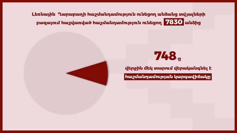 Նախարարությունից տեղեկացրին, որ 2023թ. նոյեմբերի 30-ի դրությամբ՝ Միգրացիայի ՏՀ-ում, «Փյունիկ» և «E-Disability» համակարգերում, ինչպես նաև Լեռնային Ղարաբաղի հաշմանդամություն ունեցող անձանց տվյալների բազայում հաշվառված են հաշմանդամություն ունեցող 7830 անձ։ Նրանցից 748-ը վերջին մեկ տարում վերականգնել է հաշմանդամության կարգավիճակը։