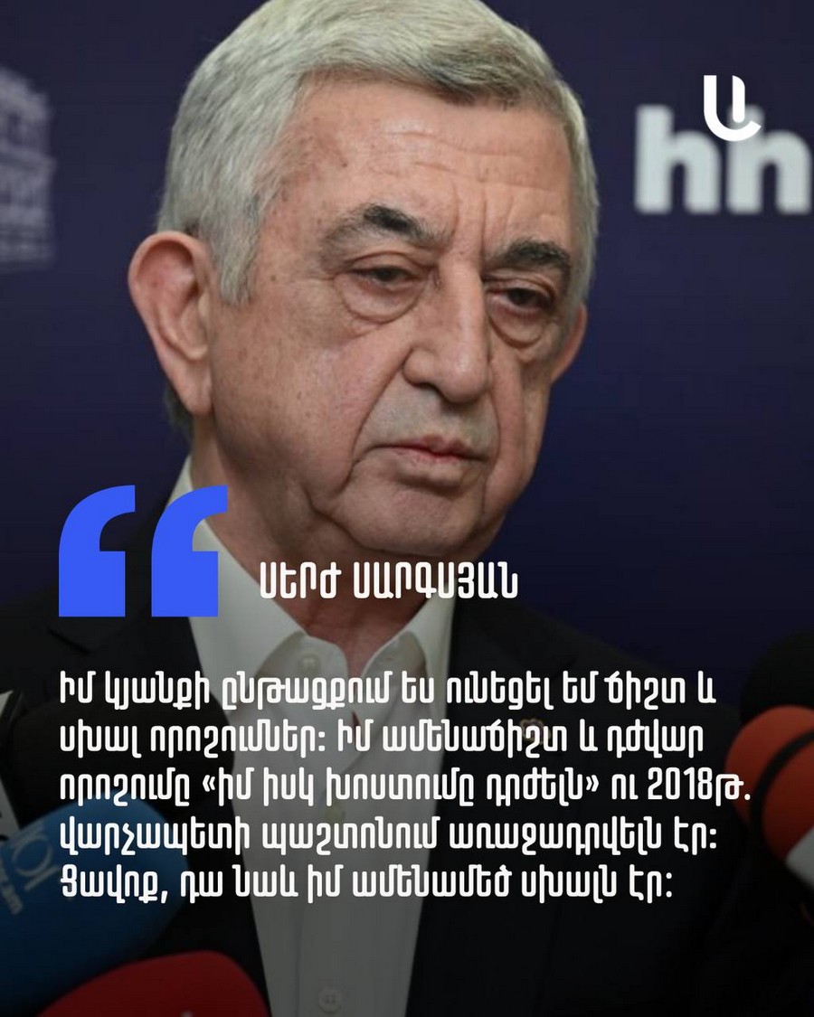 2018 թվականին ես առաջադրվեցի, որպեսզի երաշխավորեմ Հայաստանի ու Արցախի անվտանգությունը, որպեսզի սահմաններին չլինի արյունահեղություն, ապա հրաժարական տվեցի, որպեսզի սահմանների ներսում թույլ չտամ արյունահեղություն։ Իսկ այսօր՝ իմ հրաժարականից ութ տարի անց, ժողովրդի մի ստվար մաս համարում է, որ Նիկոլի իշխանությունը կա այնքան ժամանակ, քանի դեռ նրա դեմ քաղաքական պայքարի առաջին շարքում «նախկիններն» են։