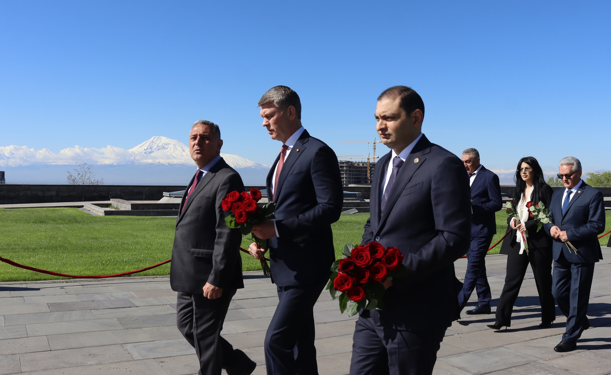 Երկու երկրների պաշտոնյաները ծաղկեպսակ են դրել Հայոց ցեղասպանության զոհերի հիշատակը հավերժացնող հուշակոթողին, որից հետո պատվիրակության անդամները ծաղիկներ են դրել անմար կրակի մոտ և մեկ րոպե լռությամբ հարգել Հայոց ցեղասպանության զոհերի հիշատակը: