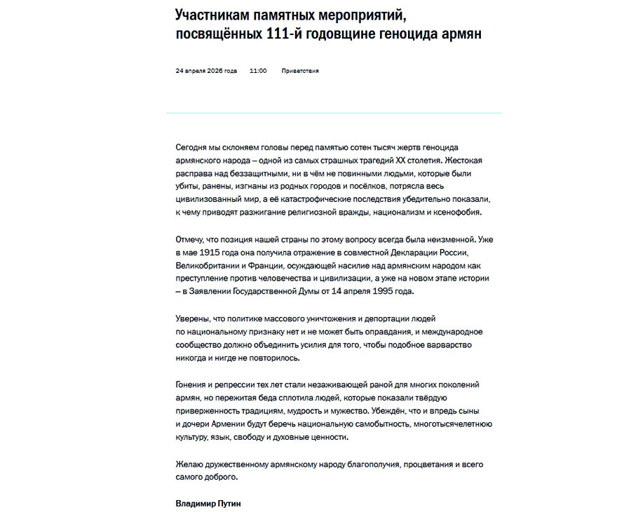ՌԴ նախագահ Վլադիմիր Պուտինը ուղերձ է հղել Հայոց ցեղասպանության 111-րդ տարելիցի կապակցությամբ: