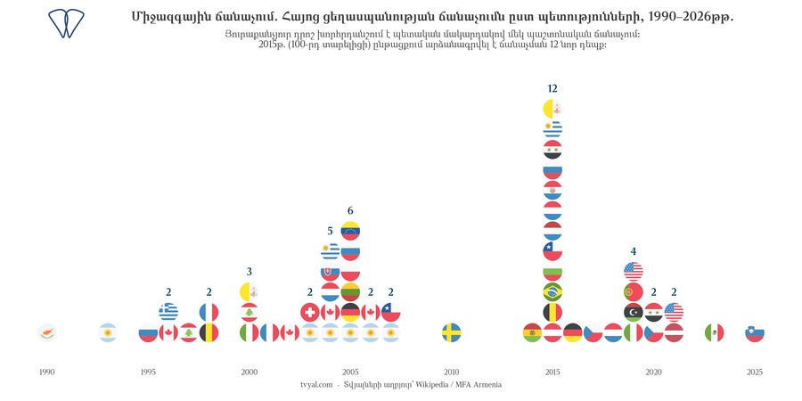 2026 թվականի ապրիլի դրությամբ Հայոց ցեղասպանությունը ճանաչել է 35 ինքնիշխան պետություն։ Վերոնշյալ գծապատկերում արտացոլված են 1990 թվականից ի վեր արձանագրված ճանաչման ակտերը՝ ըստ տարիների։ Վիճակագրական պատկերը փաստում է երեք հիմնական միտում. 1990-ականներին գործընթացը կրել է հատվածական բնույթ, մինչդեռ 2015 թվականին արձանագրվել է աննախադեպ ակտիվություն (Ավստրիան, Բելգիան, Բրազիլիան, Բուլղարիան, Չիլին, Լյուքսեմբուրգը և ևս վեց պետություն ընդունել են ճանաչման բանաձևեր մեկ օրացուցային տարվա ընթացքում՝ պայմանավորված 100-րդ տարելիցի հանգամանքով)։ Ընդ որում, 2021 թվականից հետո գծապատկերով փաստվում է ցուցանիշների կտրուկ անկում։
