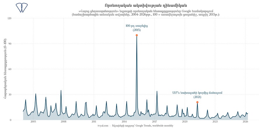 Համաձայն որոնողական համակարգերի տվյալների (Google Trends, 2004 թվականից ի վեր)՝ յուրաքանչյուր ապրիլ ամսին «Հայոց ցեղասպանություն» եզրույթի նկատմամբ գլոբալ որոնողական հետաքրքրությունը կտրուկ աճում է, պահպանվում մի քանի շաբաթ և ապա վերադառնում ելակետային մակարդակի։ Ստորև ներկայացվող գծապատկերով հաստատվում է այս պարբերական օրինաչափությունը։